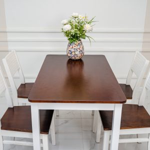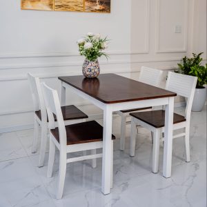 Bộ bàn ăn gỗ 4 ghế ngồi với thiết kế trẻ trung hiện đại, nhỏ gọn, cực kì tiện lợi và phù hợp với mọi không gian trong gia đình. Được sản xuất từ chất liệu gỗ cao su tự nhiên đã qua tẩm sấy kỹ lưỡng, đảm bảo chất lượng, không bị cong vênh và mối mọt theo thời gian. Bề mặt được phủ sơn PU cao cấp giúp chống ẩm, hạn chế các vết trầy xước và an toàn cho sức khoẻ người dùng.